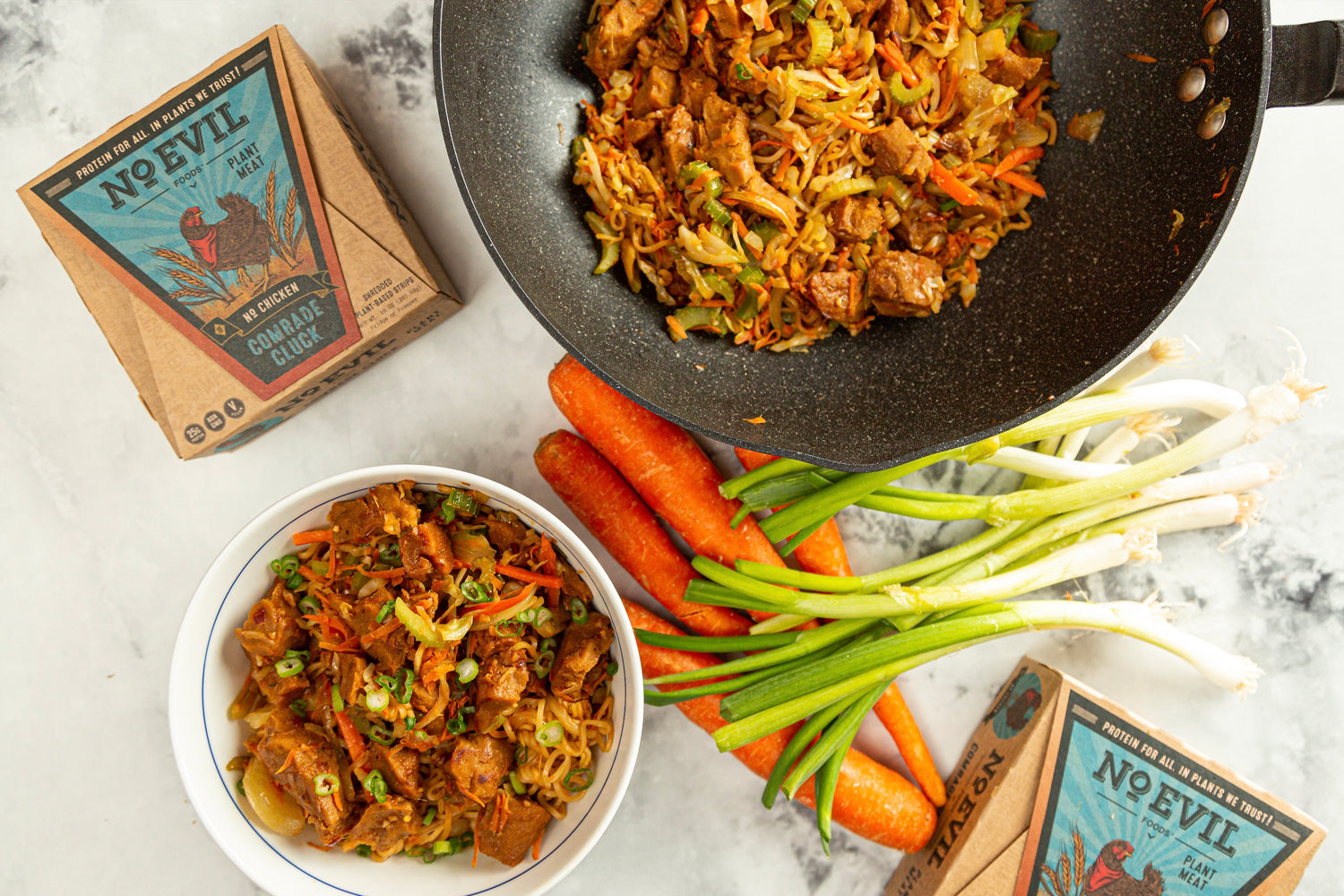 2. Add sesame oil to the bottom of the pot and add Classic Cluck ‘No Chicken’, crumbling it into pieces as you add it.